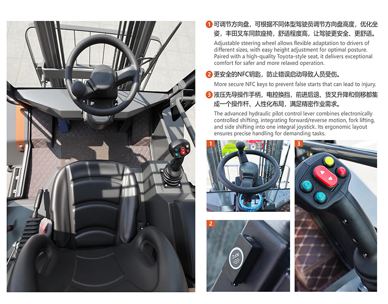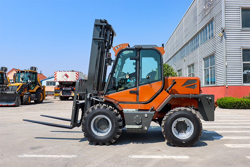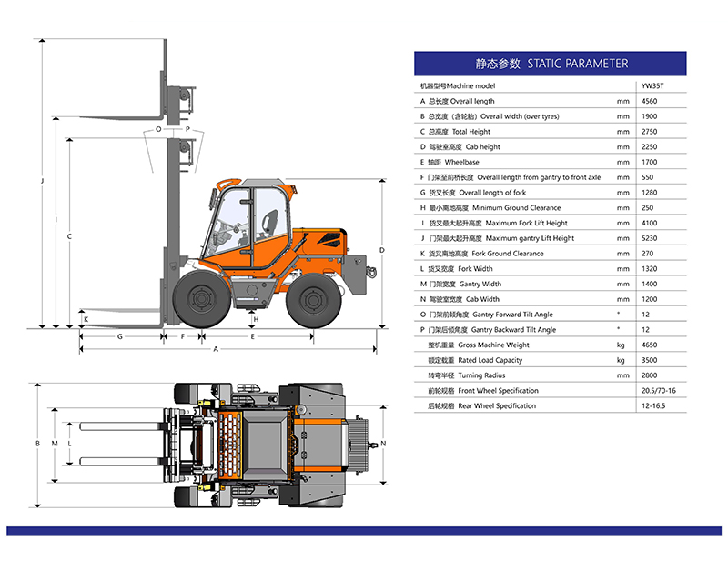 一體式越野叉車(YW35T)為加厚貨叉,精選鋼材提升載重,前輪20.5半實心輪胎,后輪12-16.5真空鋼絲輪胎,后輪轉(zhuǎn)向,承載 力和脫困能力更強(qiáng),軸距短,一體式車架,無鉸接,轉(zhuǎn)彎半徑小,轉(zhuǎn)向角度大,更適合狹小 空間作業(yè),加裝安全示寬警示燈,保證夜間安全距離作業(yè),發(fā)動機(jī)后機(jī)蓋可向上開啟,更換濾芯更容易,后方擋泥板承載力強(qiáng),可 供保養(yǎng)人員站立。